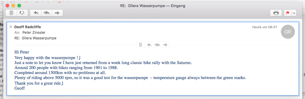 Wasserpumpe für Gilera Saturno Australien Pete 2017-04-19 0 Allgemein, Gilera Projekte Heute erreichte uns eine eMail aus Australien, wo eine unserer WPs im Einsatz ist: