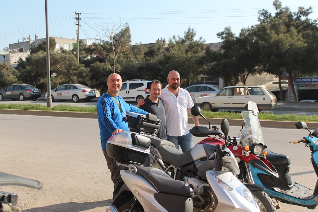 Nach wenigen Minuten trat ein Türke mittleren Alters an uns heran, der auf die beiden Maschinen an der Straße aufmerksam wurde. Die üblichen Fragen, woher wir kommen und wohin die Reise geht wurden gestellt. Er sprach ein verständliches Englisch, war nach seinen Aussagen auch ein begeisterter Motorradfahrer und so unterhielten wir uns über dies und das. Das Gespräch kam auf den bereits abgefahrenen Hinterreifen von Philipp`s KTM und ehe wir uns versahen, hatte er sein Handy gezückt und einen Bekannten im über 100 KM entfernten Bandirma am Telefon. Er gab das Gerät weiter an Philipp, der nach einigen Minuten die GPS-Koordinaten eines Reifenhändlers hatte, der den gewünschten Continental-Reifen scheinbar auf Lager hatte. Natürlich war das für uns ein Idealfall, da Bandirma sowieso auf dem Weg nach Bursa lag. So machten wir uns auf den Weg um zu sehen, was an der Sache mit den neuen Reifen dran war.