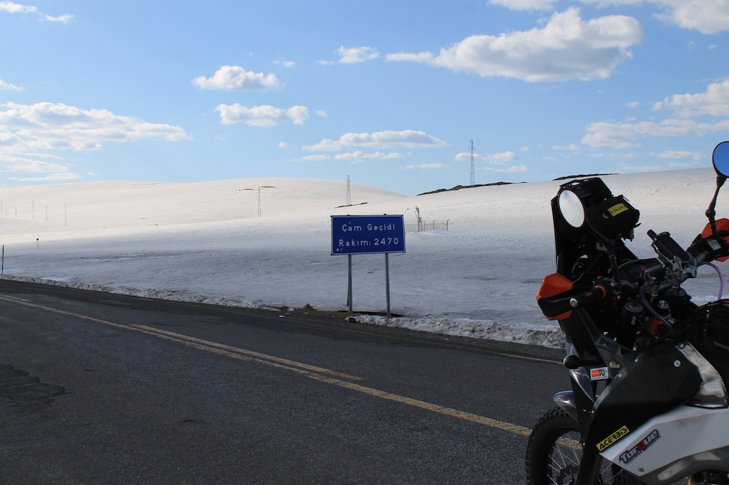 Zusammen legten wir an diesem Tage die Strecke bis knapp hinter die türkisch-georgische Grenze zurück, einer Strecke von etwas mehr als 300 Kilometer inklusive ca. 6.500 überwundener Höhenmeter (!!!). Es waren 2 sehr schöne Pässe dabei, beide noch in einigen Teilen mit Schneefeldern bedeckt und auf Höhen von über 2.400 Meter. Den zweiten Pass erreichten wir erst am späten Nachmittag und so wurde es dann ab einer gewissen Höhe auch recht frisch.
