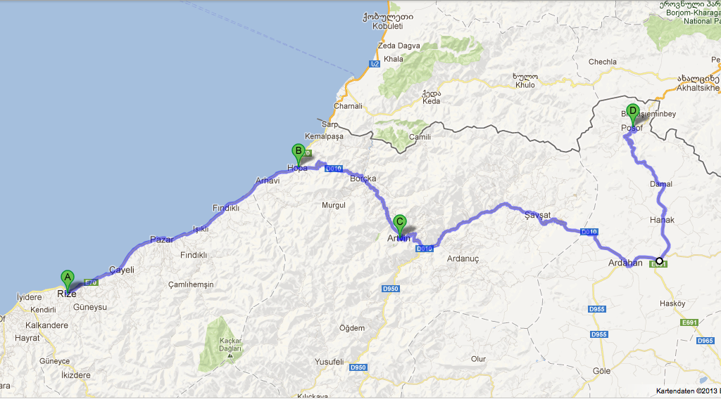 Nach der Durchquerung von Griechenland und der Türkei und ca. 3.500 Kilometern gemeinsam zurückgelegter Strecke durch 3 Länder sollten sich unsere Wege an dieser Stelle, wie ursprünglich gedacht, doch noch nicht trennen. Mein Plan stand ja so weit schon fest, ich musste mehr oder weniger durch Georgien reisen, um nach Aserbaidschan bzw. zum Fährhafen nach Baku zu kommen. Die südliche Route durch den Iran schien mir zu unsicher. Philipp warf seine Pläne dann aber kurzfristig über den Haufen und beschloss, sich meiner Reise vorerst bis nach Tiflis (Georgien) anzuschließen und so noch weitere 2 – 3 Tage mit mir zu Reisen.