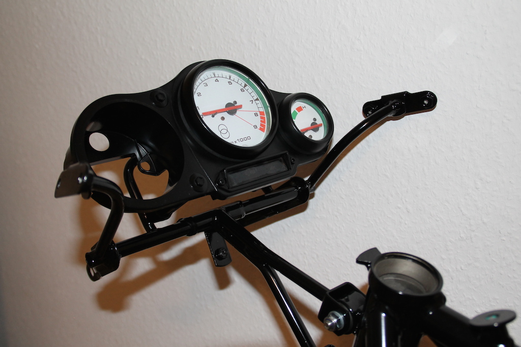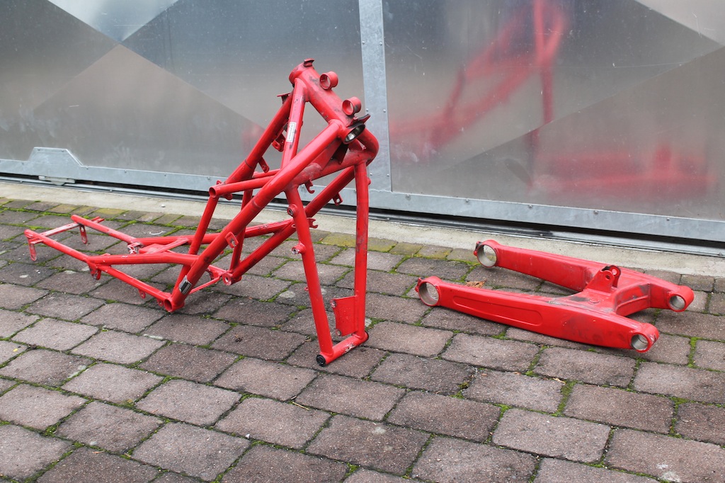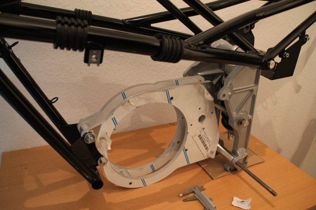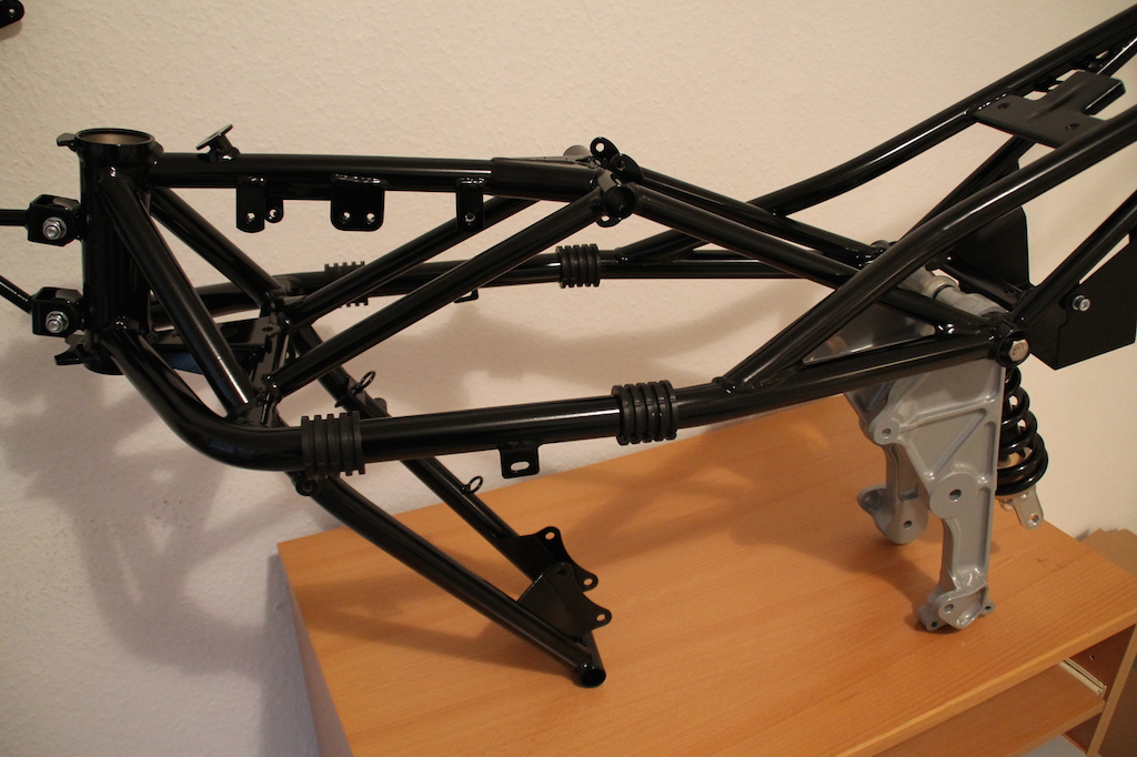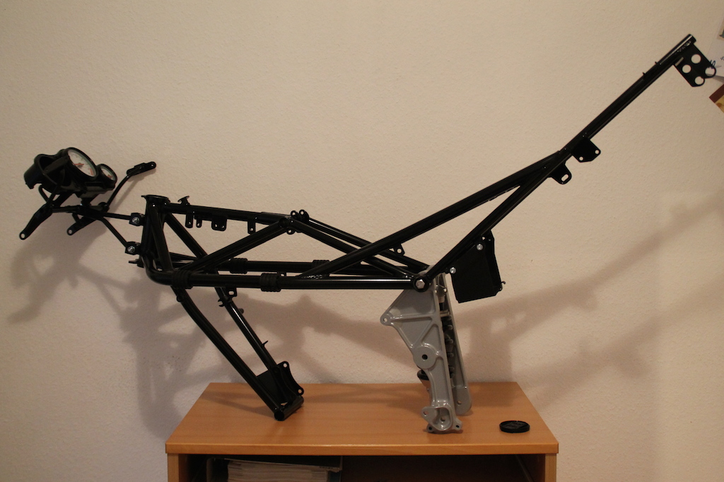 Den Anfang machte natürlich die komplette Überarbeitung des Rahmens, Schwinge, Vorbau und einiger Teile des Fahrwerks. Diesen habe ich zur Überarbeitung in einem Fachbetrieb glasperlstrahlen und in schwarz glänzend pulverbeschichten lassen.