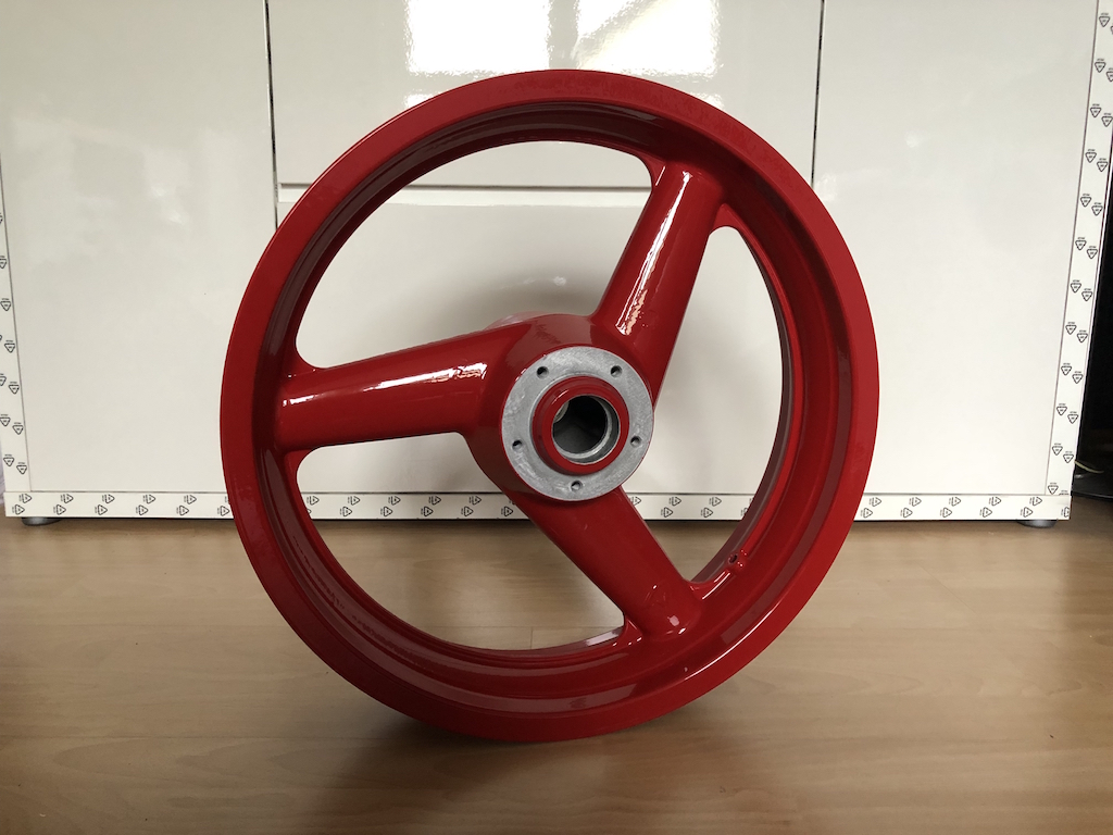 Die Felge wurde chemisch entlackt, gestrahlt und neu pulverbeschichtet.